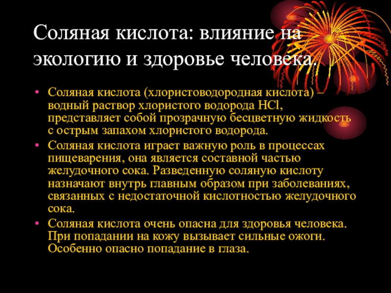 Слайд 17Соляная кислота: влияние на экологию и здоровье человека.