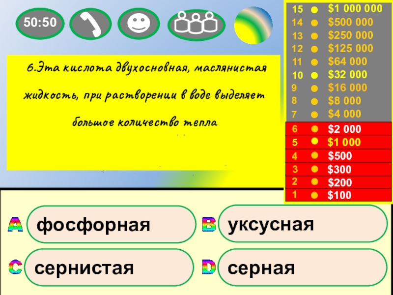 6.Эта кислота двухосновная, маслянистая жидкость, при растворении в воде выделяет большое количество тепла