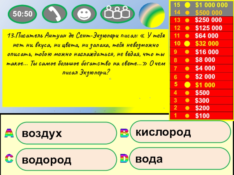 13.Писатель Антуан де Сент-Экзюпери писал: « У тебя нет ни вкуса, ни цвета, ни запаха, тебя невозможно описать, тобою можно наслаждаться, не ведая, что ты такое… Ты самое большое богатство на свете…» О чем писал Экзюпери?