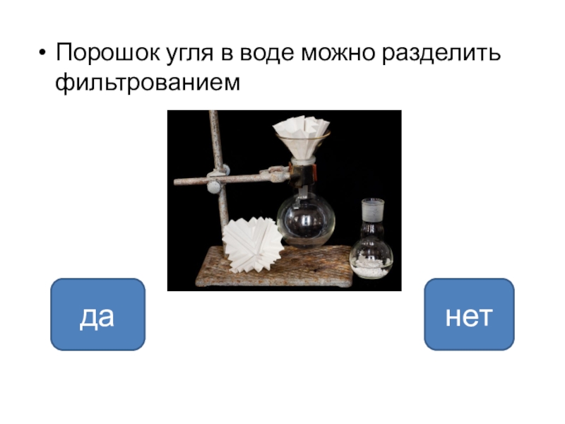Слайд 4Порошок угля в воде можно разделить фильтрованием
