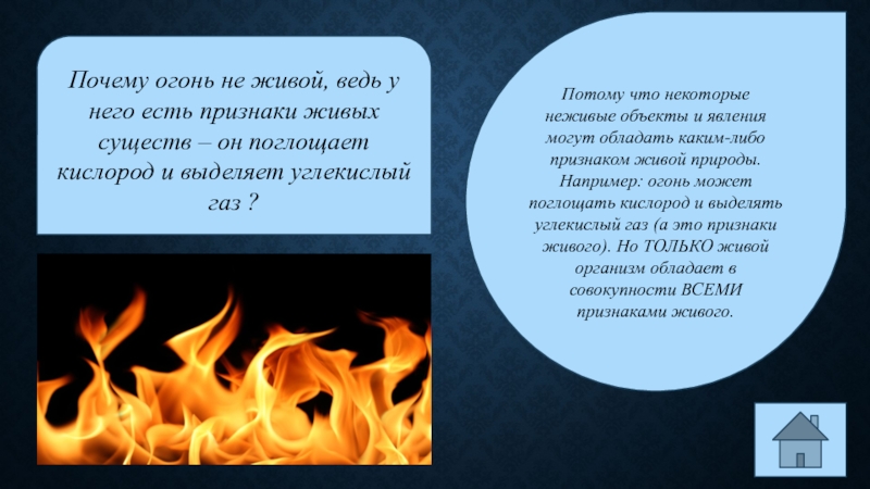 Почему огонь не живой, ведь у него есть признаки живых существ – он поглощает кислород и выделяет углекислый газ ?