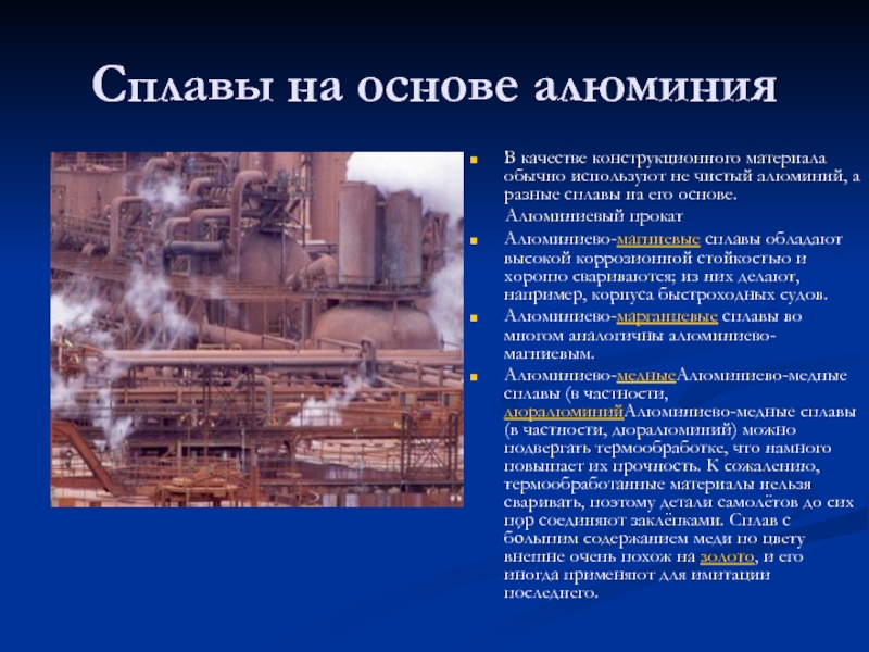 Алюминиево-медныеАлюминиево-медные сплавы (в частности, дюралюминийАлюминиево-медные сплавы (в частности, дюралюминий) можно подвергать термообработке, что намного повышает их прочность. К сожалению, термообработанные материалы нельзя сваривать, поэтому детали самолётов до сих пор соединяют заклёпками. Сплав с бо́льшим содержанием меди по цвету внешне очень похож на золото, и его иногда применяют для имитации последнего.