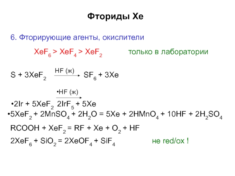 5XeF2 + 2MnSO4 + 2H2O = 5Xe + 2HMnO4 + 10HF + 2H2SO4 RCOOH + XeF2 = RF + Xe + O2 + HF