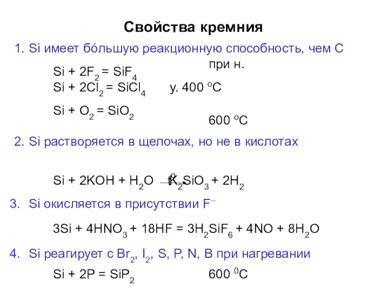 Si реагирует с Br2, I2, S, P, N, B при нагревании