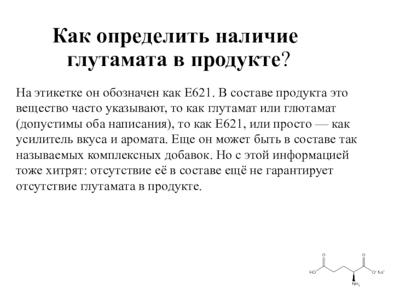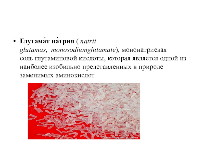 Слайд 7Глутама́т на́трия ( natrii glutamas, monosodiumglutamate), мононатриевая соль глутаминовой кислоты, которая является одной из наиболее