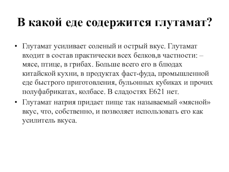 входит в состав практически всех белков,в частности: – мясе, птице, в грибах. Больше всего его в блюдах китайской кухни, в продуктах фаст-фуда, промышленной еде быстрого приготовления, бульонных кубиках и прочих полуфабрикатах, колбасе. В сладостях Е621 нет.