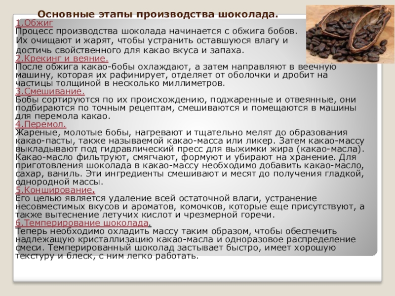 После обжига какао-бобы охлаждают, а затем направляют в веечную машину, которая их рафинирует, отделяет от оболочки и дробит на частицы толщиной в несколько миллиметров.