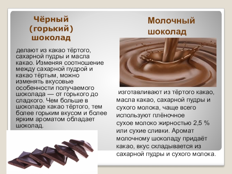 масла какао. Изменяя соотношение между сахарной пудрой и какао тёртым, можно изменять вкусовые особенности получаемого шоколада — от горького до сладкого. Чем больше в шоколаде какао тёртого, тем более горьким вкусом и более ярким ароматом обладает шоколад.