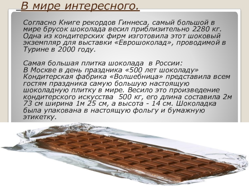 в мире брусок шоколада весил приблизительно 2280 кг. Одна из кондитерских фирм изготовила этот шоковый экземпляр для выставки «Еврошоколад», проводимой в Турине в 2000 году.