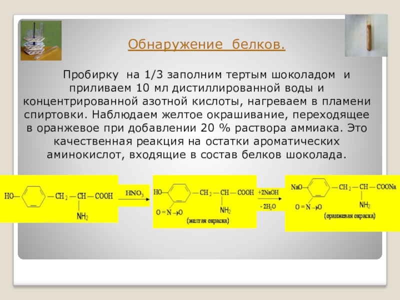 10 мл дистиллированной воды и концентрированной азотной кислоты, нагреваем в пламени спиртовки. Наблюдаем желтое окрашивание, переходящее в оранжевое при добавлении 20 % раствора аммиака. Это качественная реакция на остатки ароматических аминокислот, входящие в состав белков шоколада.