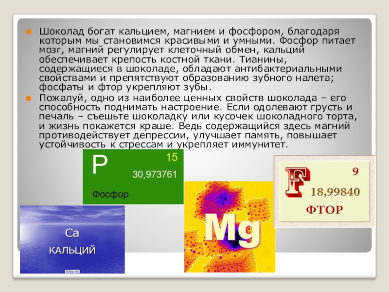 и умными. Фосфор питает мозг, магний регулирует клеточный обмен, кальций обеспечивает крепость костной ткани. Тианины, содержащиеся в шоколаде, обладают антибактериальными свойствами и препятствуют образованию зубного налета; фосфаты и фтор укрепляют зубы.