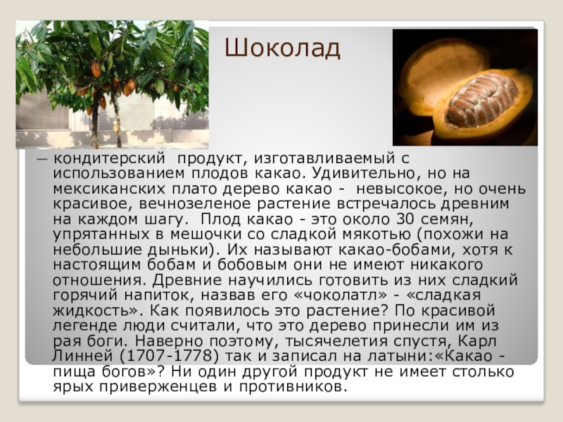 но на мексиканских плато дерево какао - невысокое, но очень красивое, вечнозеленое растение встречалось древним на каждом шагу. Плод какао - это около 30 семян, упрятанных в мешочки со сладкой мякотью (похожи на небольшие дыньки). Их называют какао-бобами, хотя к настоящим бобам и бобовым они не имеют никакого отношения. Древние научились готовить из них сладкий горячий напиток, назвав его «чоколатл» - «сладкая жидкость». Как появилось это растение? По красивой легенде люди считали, что это дерево принесли им из рая боги. Наверно поэтому, тысячелетия спустя, Карл Линней (1707-1778) так и записал на латыни:«Какао - пища богов»? Ни один другой продукт не имеет столько ярых приверженцев и противников.