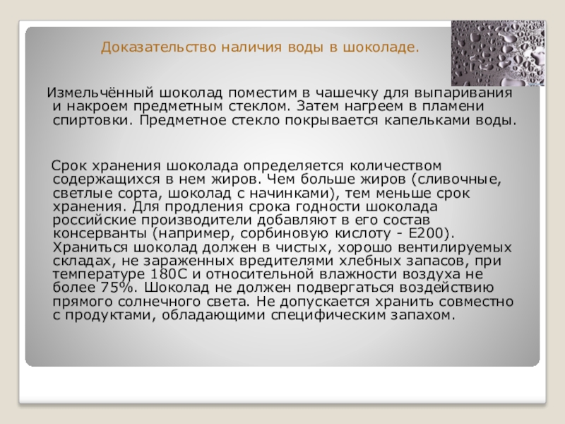 Измельчённый шоколад поместим в чашечку для выпаривания и накроем предметным стеклом. Затем нагреем в пламени спиртовки. Предметное стекло покрывается капельками воды.