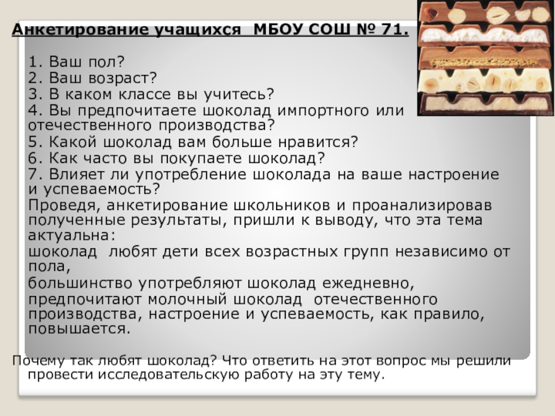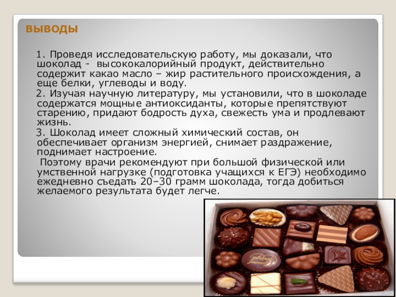 1. Проведя исследовательскую работу, мы доказали, что шоколад -