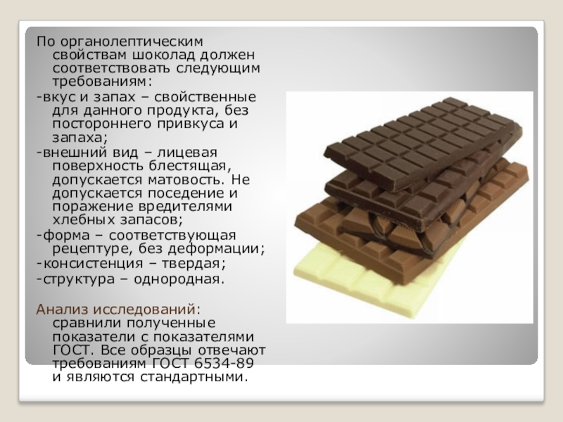 По органолептическим свойствам шоколад должен соответствовать следующим требованиям: