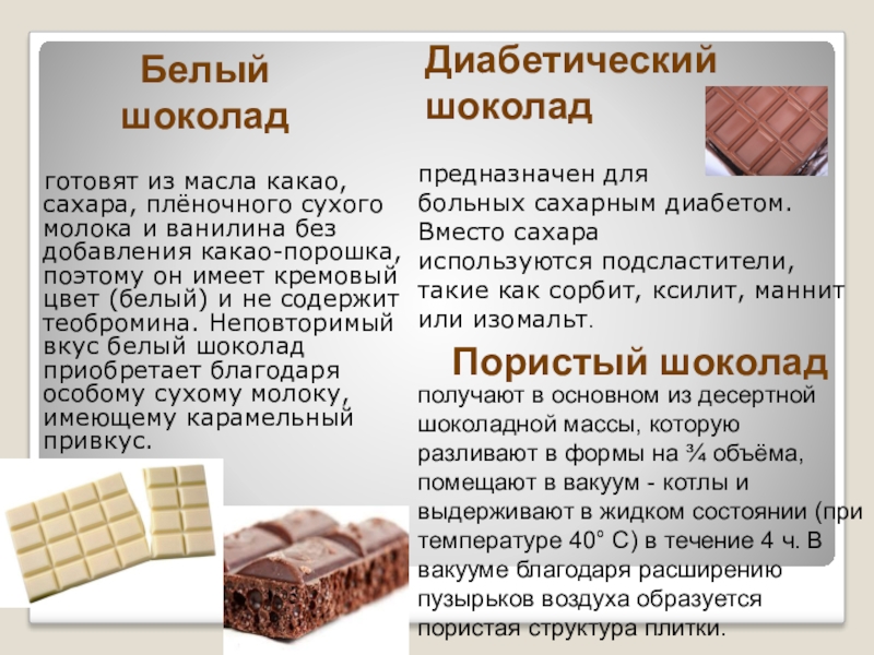 1-1,5% - теобромина и кофеина, а также столь необходимые организму натрий, калий, магний, фосфор, железо и витамины В1, В2 и РР. Это означает, что шоколад имеет большую часть пищевых компонентов необходимых для полноценного питания. В зависимости от состава и способа обработки шоколад делят на горький, молочный, диабетический и белый.