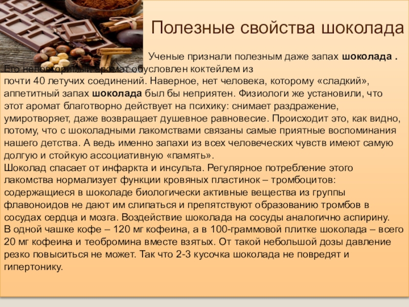 Ученые признали полезным даже запах шоколада . Его неповторимый аромат обусловлен коктейлем из почти 40 летучих соединений. Наверное, нет человека, которому «сладкий», аппетитный запах шоколада был бы неприятен. Физиологи же установили, что этот аромат благотворно действует на психику: снимает раздражение, умиротворяет, даже возвращает душевное равновесие. Происходит это, как видно, потому, что с шоколадными лакомствами связаны самые приятные воспоминания нашего детства. А ведь именно запахи из всех человеческих чувств имеют самую долгую и стойкую ассоциативную «память».