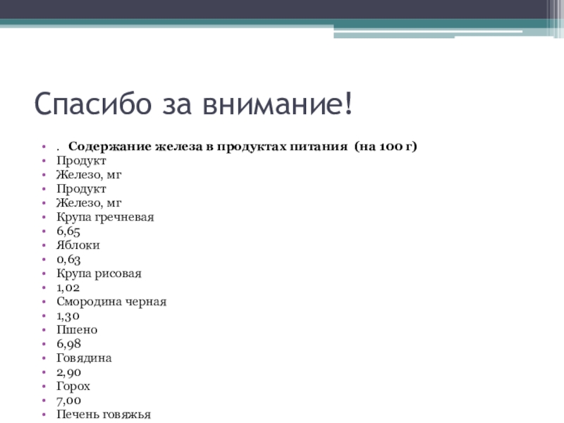 . Содержание железа в продуктах питания (на 100