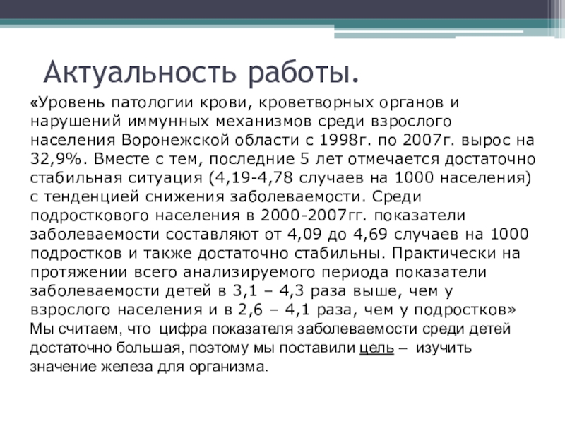 Мы считаем, что цифра показателя заболеваемости среди детей достаточно большая, поэтому мы поставили цель – изучить значение железа для организма.
