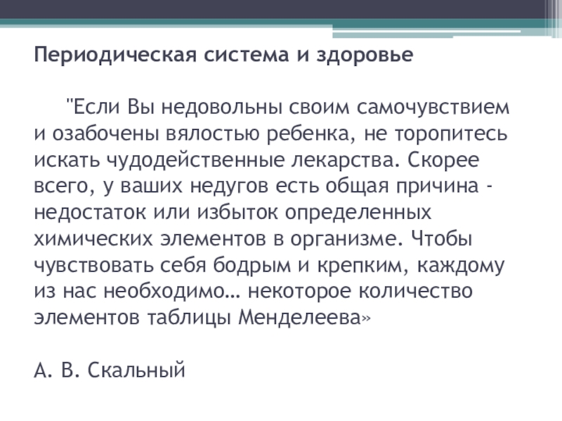 и озабочены вялостью ребенка, не торопитесь искать чудодейственные лекарства. Скорее всего, у ваших недугов есть общая причина - недостаток или избыток определенных химических элементов в организме. Чтобы чувствовать себя бодрым и крепким, каждому из нас необходимо… некоторое количество элементов таблицы Менделеева»