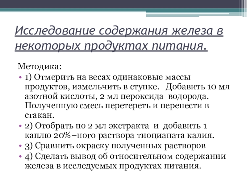Слайд 7Исследование содержания железа в некоторых продуктах питания.