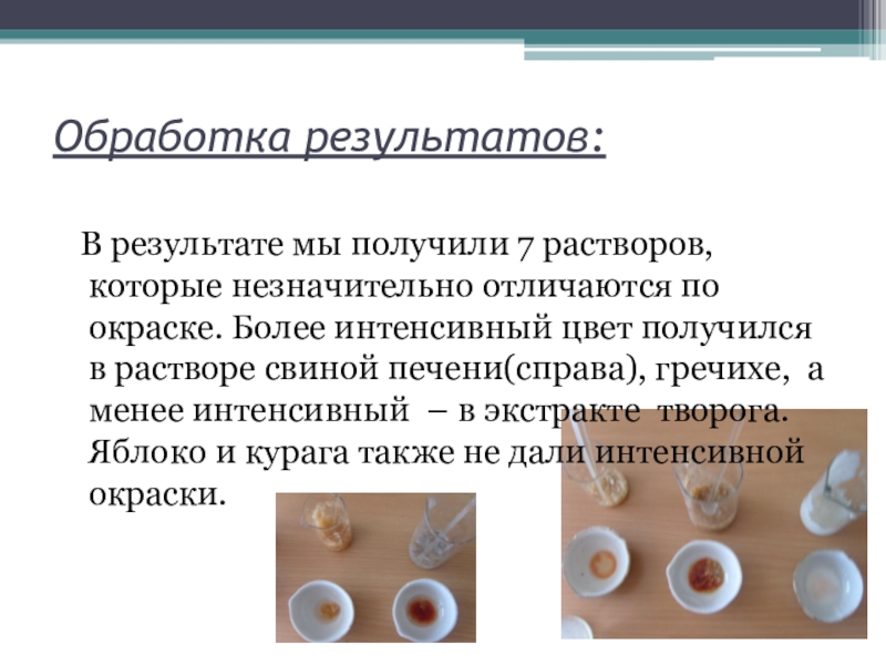 по окраске. Более интенсивный цвет получился в растворе свиной печени(справа), гречихе, а менее интенсивный – в экстракте творога. Яблоко и курага также не дали интенсивной окраски.