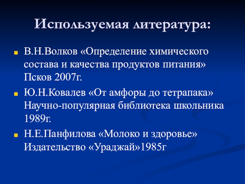 В.Н.Волков «Определение химического состава и качества продуктов питания» Псков 2007г.