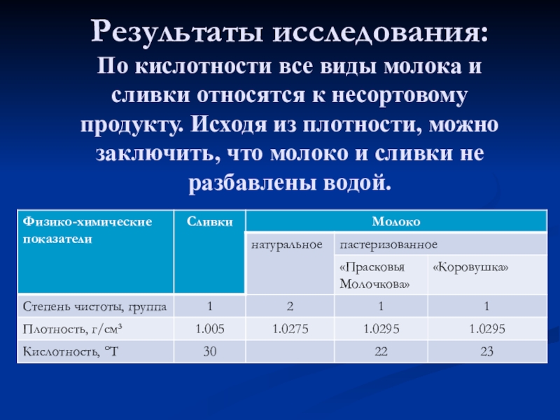 Значение плотности по таблице: 1,0295 г/см³ у пастеризованного, 1,0275 г/см³ у непастеризованного, 1,005г/см³ у сливок.
