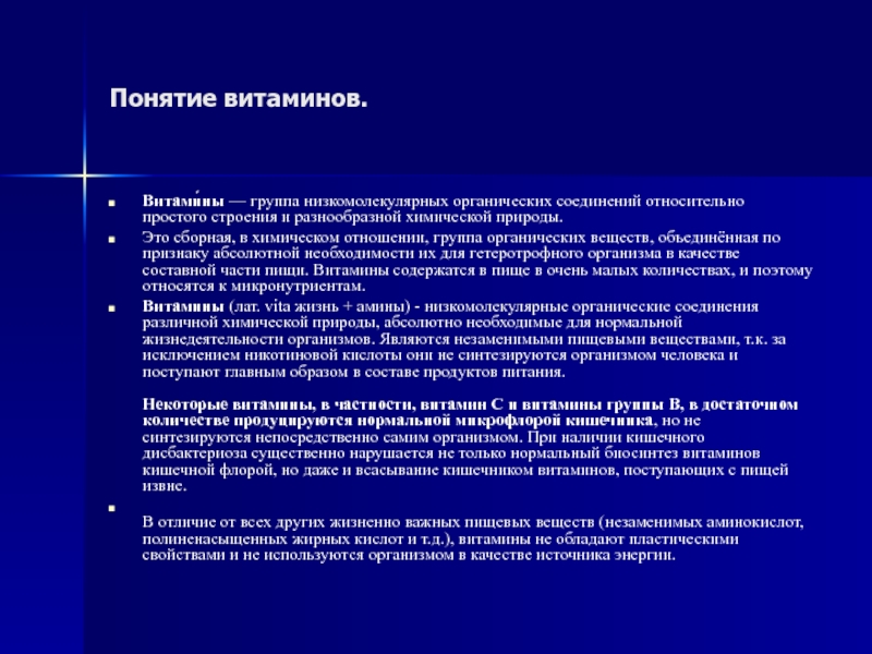Витамины (лат. vita жизнь + амины) - низкомолекулярные органические соединения различной химической природы, абсолютно необходимые для нормальной жизнедеятельности организмов. Являются незаменимыми пищевыми веществами, т.к. за исключением никотиновой кислоты они не синтезируются организмом человека и поступают главным образом в составе продуктов питания.
