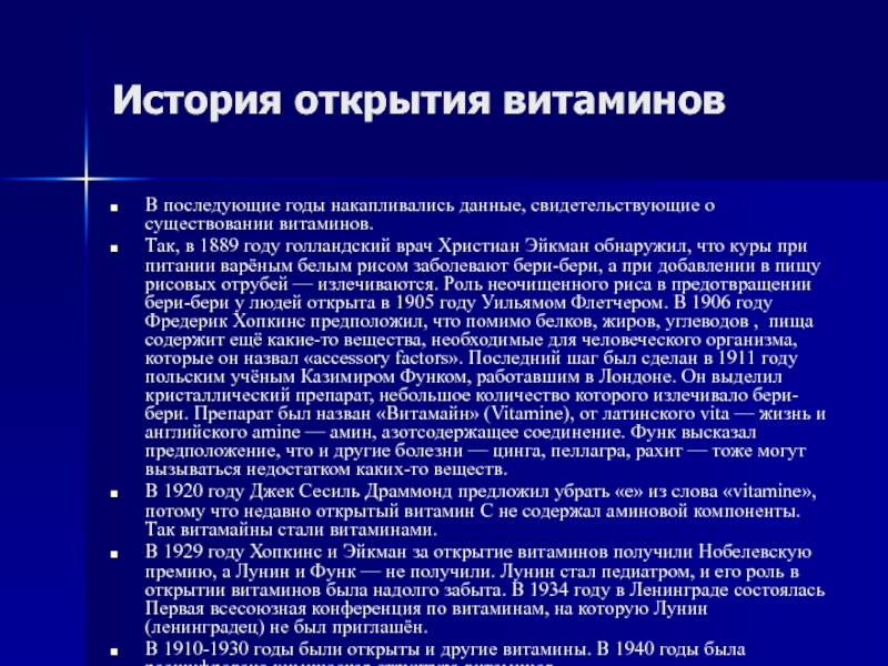 В последующие годы накапливались данные, свидетельствующие о существовании витаминов.