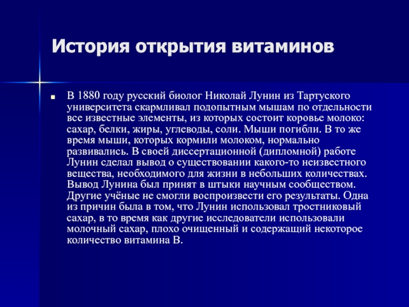 университета скармливал подопытным мышам по отдельности все известные элементы, из которых состоит коровье молоко: сахар, белки, жиры, углеводы, соли. Мыши погибли. В то же время мыши, которых кормили молоком, нормально развивались. В своей диссертационной (дипломной) работе Лунин сделал вывод о существовании какого-то неизвестного вещества, необходимого для жизни в небольших количествах. Вывод Лунина был принят в штыки научным сообществом. Другие учёные не смогли воспроизвести его результаты. Одна из причин была в том, что Лунин использовал тростниковый сахар, в то время как другие исследователи использовали молочный сахар, плохо очищенный и содержащий некоторое количество витамина B.