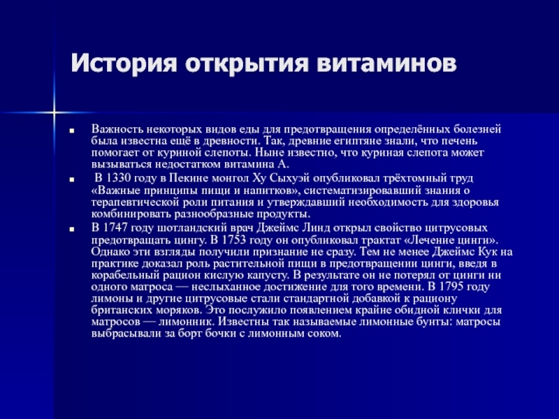 известна ещё в древности. Так, древние египтяне знали, что печень помогает от куриной слепоты. Ныне известно, что куриная слепота может вызываться недостатком витамина А.