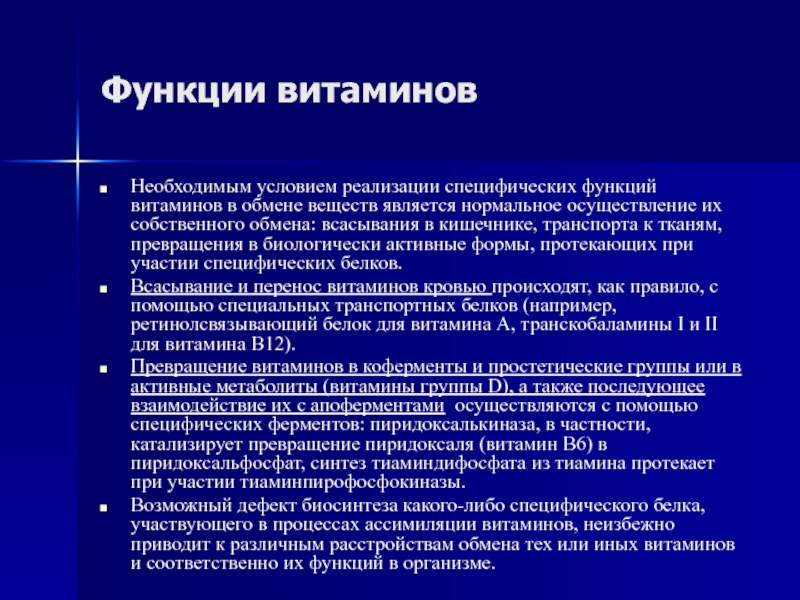 нормальное осуществление их собственного обмена: всасывания в кишечнике, транспорта к тканям, превращения в биологически активные формы, протекающих при участии специфических белков.