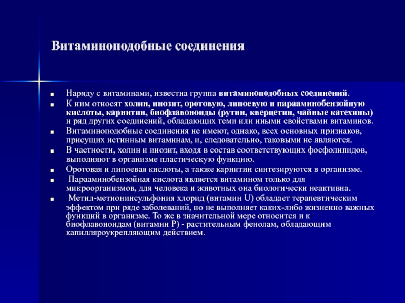 Витаминоподобные соединения не имеют, однако, всех основных признаков, присущих истинным витаминам, и, следовательно, таковыми не являются.