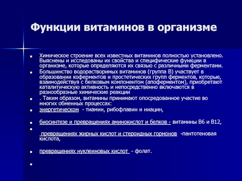 Витамины участвуют во множестве биохимических реакций, выполняя каталитическую функцию в