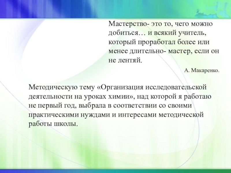 Методическую тему «Организация исследовательской деятельности на уроках химии», над которой я работаю не первый год, выбрала в соответствии со своими практическими нуждами и интересами методической работы школы.