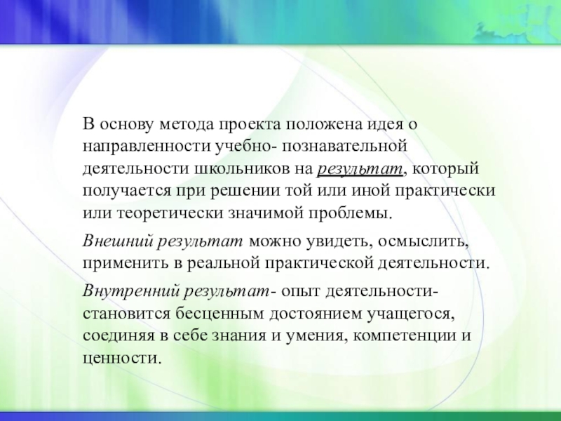 Слайд 5В основу метода проекта положена идея о направленности учебно- познавательной деятельности