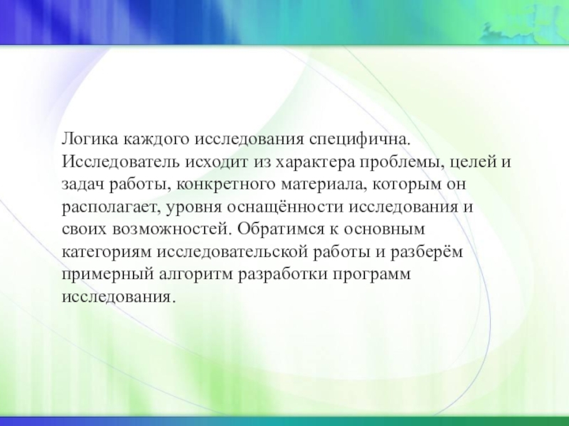 Слайд 9Логика каждого исследования специфична. Исследователь исходит из характера проблемы, целей и