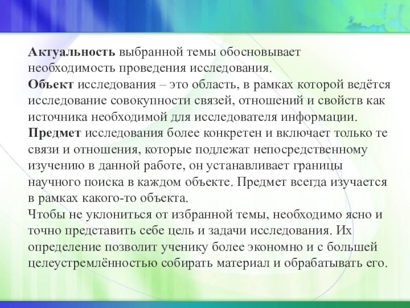 Чтобы не уклониться от избранной темы, необходимо ясно и точно представить себе цель и задачи исследования. Их определение позволит ученику более экономно и с большей целеустремлённостью собирать материал и обрабатывать его.