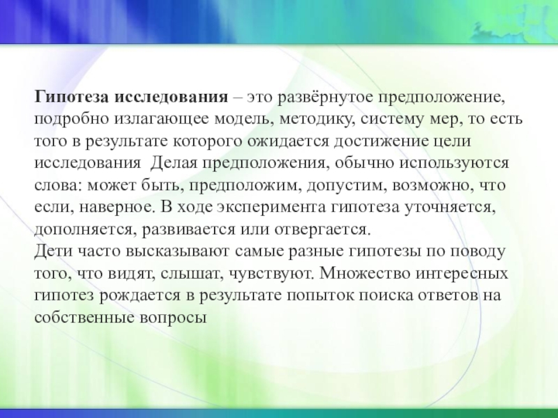 то есть того в результате которого ожидается достижение цели исследования Делая предположения, обычно используются слова: может быть, предположим, допустим, возможно, что если, наверное. В ходе эксперимента гипотеза уточняется, дополняется, развивается или отвергается.