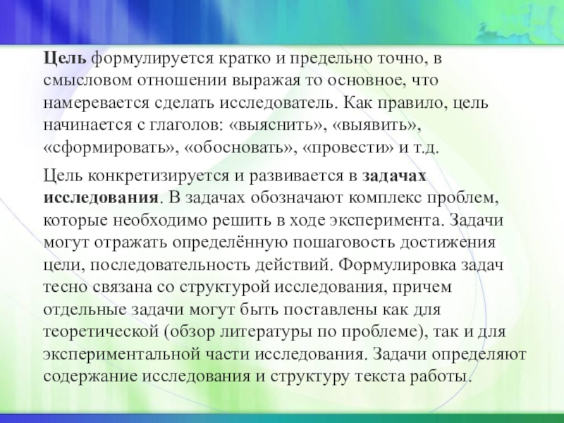 что намеревается сделать исследователь. Как правило, цель начинается с глаголов: «выяснить», «выявить», «сформировать», «обосновать», «провести» и т.д.