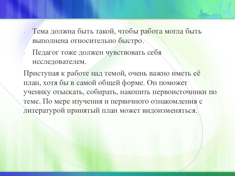 Слайд 12Тема должна быть такой, чтобы работа могла быть выполнена относительно быстро.