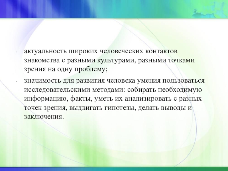 Слайд 7актуальность широких человеческих контактов знакомства с разными культурами, разными точками зрения