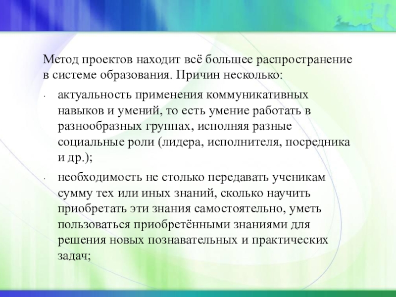 Слайд 6Метод проектов находит всё большее распространение в системе образования. Причин несколько: