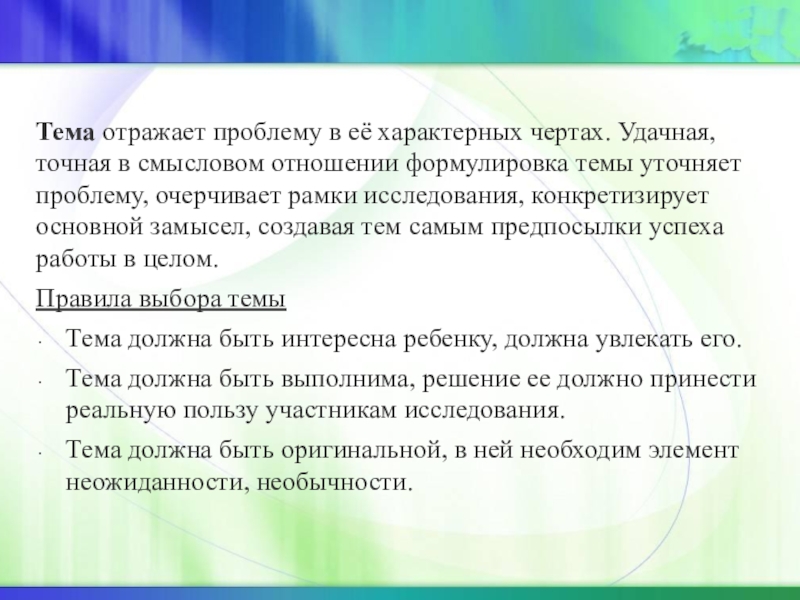 формулировка темы уточняет проблему, очерчивает рамки исследования, конкретизирует основной замысел, создавая тем самым предпосылки успеха работы в целом.