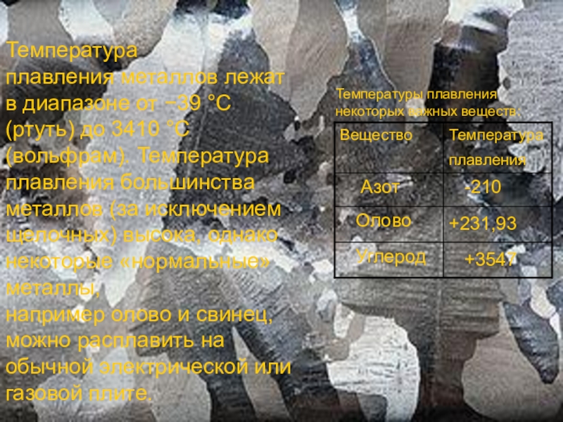 Температура плавления металлов лежат в диапазоне от −39 °C (ртуть) до 3410 °C (вольфрам). Температура плавления большинства металлов (за исключением щелочных) высока, однако некоторые «нормальные» металлы, например олово и свинец, можно расплавить на обычной электрической или газовой плите.