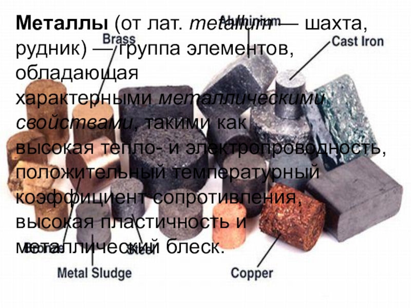 Металлы (от лат. metallum — шахта, рудник) — группа элементов, обладающая характерными металлическими свойствами, такими как высокая тепло- и электропроводность, положительный температурный коэффициент сопротивления, высокая пластичность и металлический блеск.