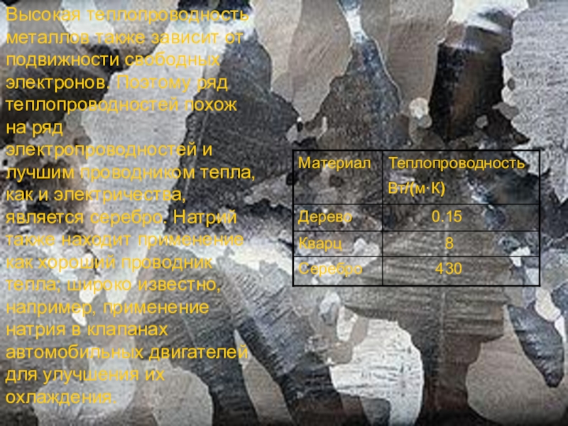 Высокая теплопроводность металлов также зависит от подвижности свободных электронов. Поэтому ряд теплопроводностей похож на ряд электропроводностей и лучшим проводником тепла, как и электричества, является серебро. Натрий также находит применение как хороший проводник тепла; широко известно, например, применение натрия в клапанах автомобильных двигателей для улучшения их охлаждения.