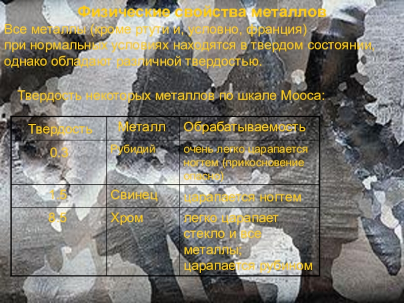 Все металлы (кроме ртути и, условно, франция) при нормальных условиях находятся в твердом состоянии, однако обладают различной твердостью.