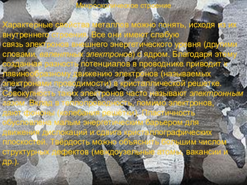 Характерные свойства металлов можно понять, исходя из их внутреннего строения. Все они имеют слабую связь электронов внешнего энергетического уровня (другими словами, валентных электронов) с ядром. Благодаря этому созданная разность потенциалов в проводнике приводит к лавинообразному движению электронов (называемых электронами проводимости) в кристаллической решетке. Совокупность таких электронов часто называют электронным газом. Вклад в теплопроводность, помимо электронов, дают фононы (колебания решётки). Пластичность обусловлена малым энергетическим барьером для движения дислокаций и сдвига кристаллографических плоскостей. Твёрдость можно объяснить большим числом структурных дефектов (междоузельные атомы, вакансии и др.).
